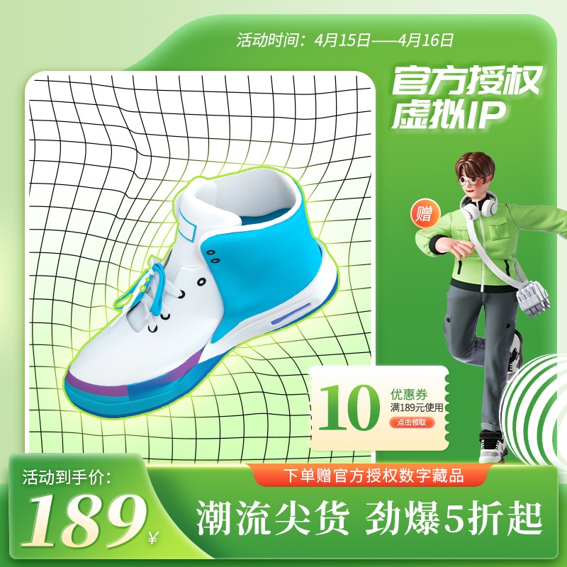 领淘教育 高点击主图 虚拟IP联名潮鞋促销主图PSD免费下载:限时5折到手价189元/赠数字藏品/满189减10 https://www.lingtaoedu.com/1265.html