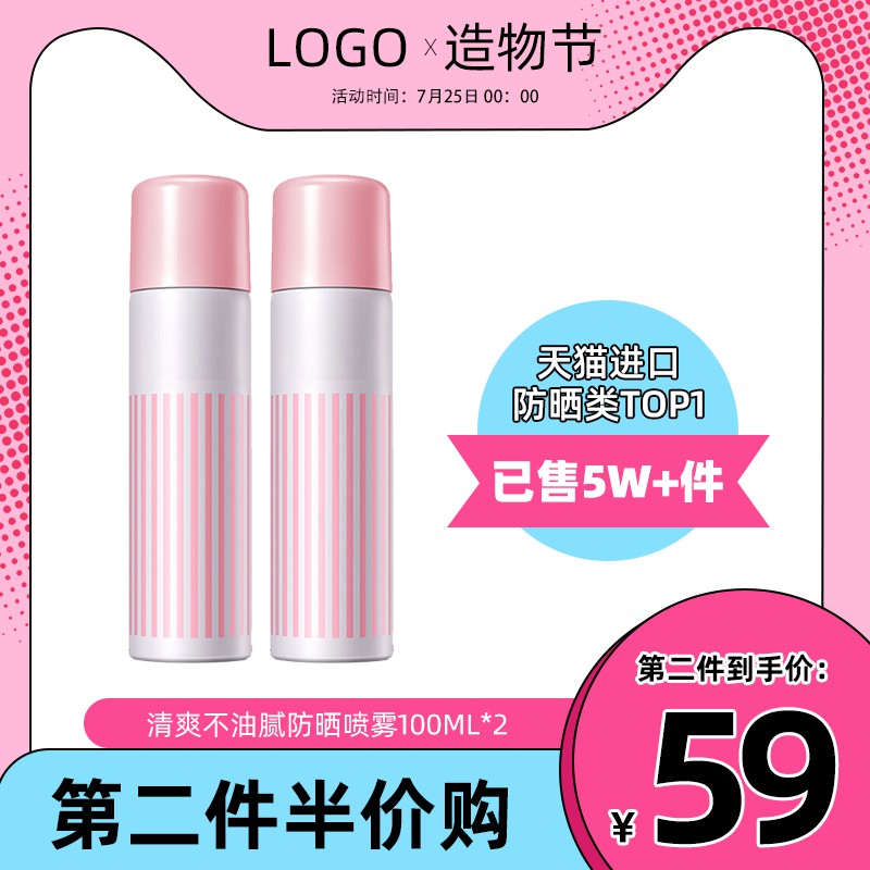领淘教育 高端通用主图 天猫造物节防晒喷雾主图PSD模板,清爽不油腻100ml*2装,第二件半价到手价59元分层素材 https://www.lingtaoedu.com/1974.html