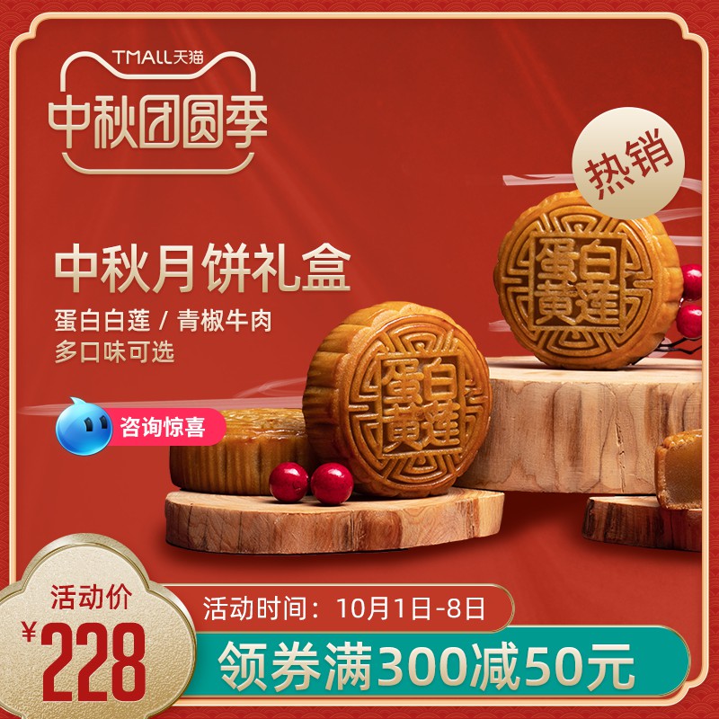 领淘教育 高端通用主图 天猫中秋月饼礼盒主图PSD模板,蛋白白莲青椒牛肉多口味,228元满300减50分层素材 https://www.lingtaoedu.com/2063.html